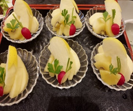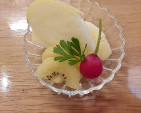 夕食に付けた果物に、ラデッシュの茎をつけて、アクセントで飾りつけです。