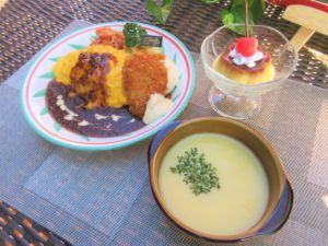 ポタージュスープ、デザートはさくらんぼがのったプリンです。