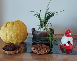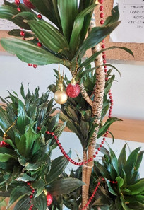玄関窓口・観葉植物にも飾りつけ、日常からクリスマスムードへ。