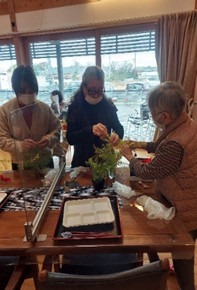 食卓花もクリスマスバージョンに・・皆さんで飾りつけです。