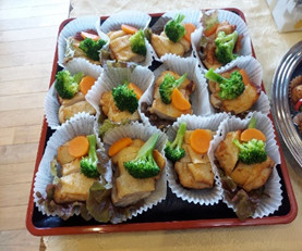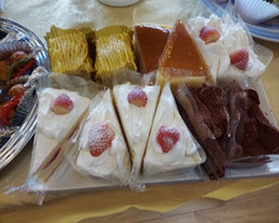 えびチリとデザートのプリン、ヨーグルトと果物盛りです。