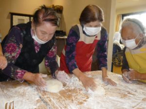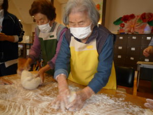 昼食後の余暇時間、デイの玄関前からもち米が蒸されるいい匂いがしてきました。