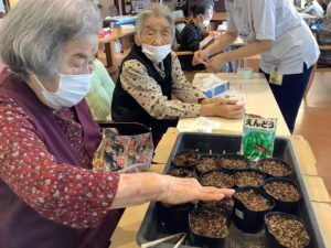 8日で発芽したので、余暇の時間に利用者2名で地植えをして頂きました。