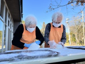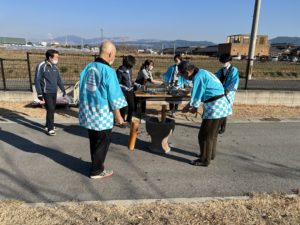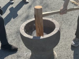 外で職員が臼と杵を使い本格的な餅つき💪🏻