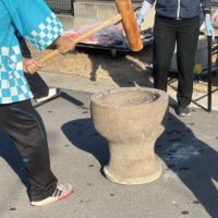 外で職員が臼と杵を使い本格的な餅つき💪🏻