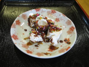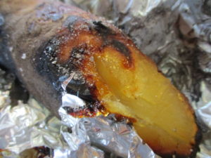 真っ黒に焼けたバナナ、中身は黒くなくチョコレートをかけていただきます😃