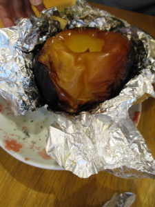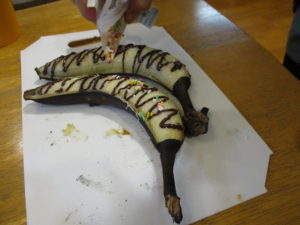 真っ黒に焼けたバナナ、中身は黒くなくチョコレートをかけていただきます😃
