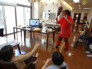 準備していた、お手玉で、容赦なく鬼退治されています(笑)