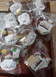 紙コップで作った小物入れに、イラストを貼ったお菓子を入れてみました。