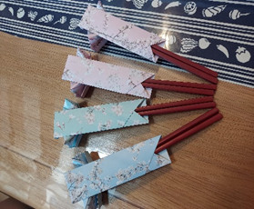 お菓子だけではと、箸袋と箸置きを折り紙で作ってみました。