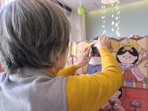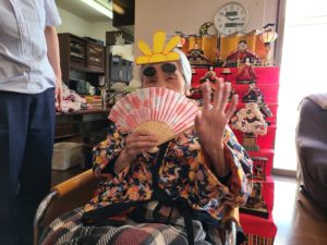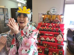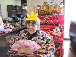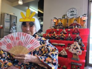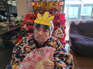 写真撮影時「私はお雛様ですよ」と他の利用者に話しかけられる姿があり、
