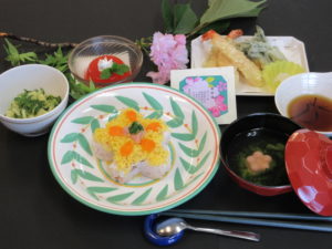 花ご飯は、桜の形の押し寿司を錦糸卵・花びら型のにんじん・三つ葉で彩りよく盛り付け、天ぷらにはタラの芽、木の芽和えには筍、すまし汁には菜の花をと、旬の食材をふんだんに取り入れました。