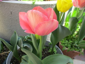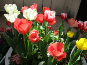 中庭のチューリップやパンジーも満開です。「わー綺麗かねー。この花は何だったかな?」等