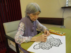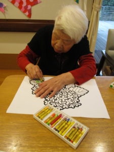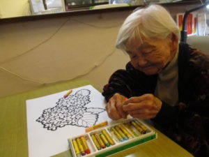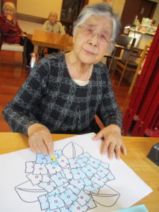 「何色がよかろかね?」「みんな色とりどりに塗るときれかろ?」「私はこれにします」とご利用者様同士お話しをされながら色を考えられておられました(^^♪