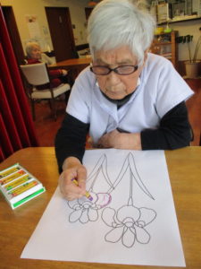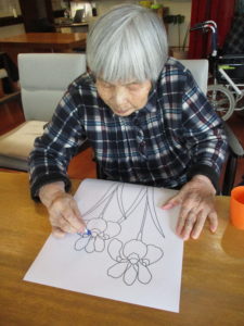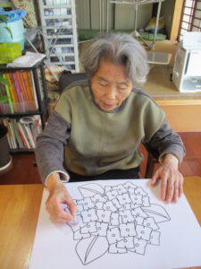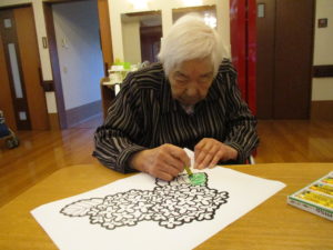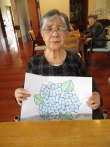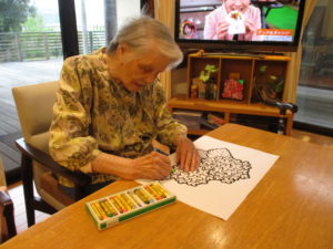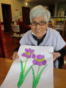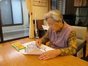 「何色がよかろかね?」「みんな色とりどりに塗るときれかろ?」「私はこれにします」とご利用者様同士お話しをされながら色を考えられておられました(^^♪