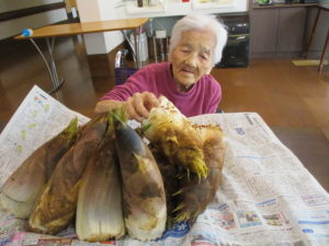 山から掘りたての旬のタケノコを職員が持ってきたので、ご利用者の皆さんに観賞を楽しんで頂き、