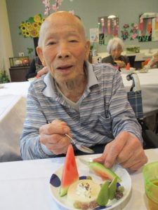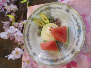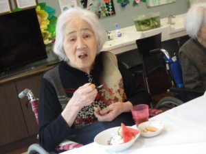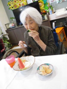 ご利用者の好きな甘納豆を散りばめて、前日にご家族様より頂いた初物のスイカも添えました(^^♪