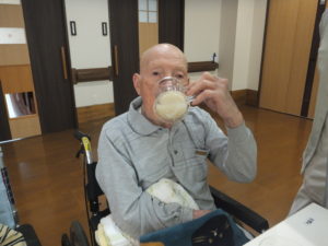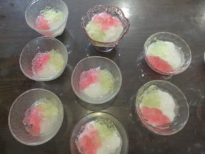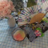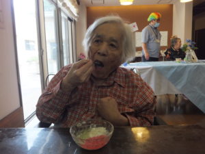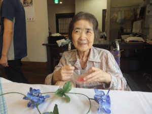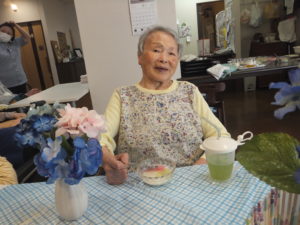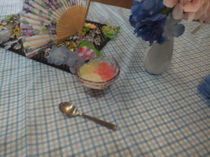 食事レクリエーションで【あじさいゼリー】を食べて頂きました。