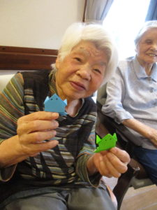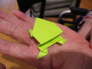 今日のレクレーション活動は・・・折り紙で作ったカエルを使って遊んでみました🐸