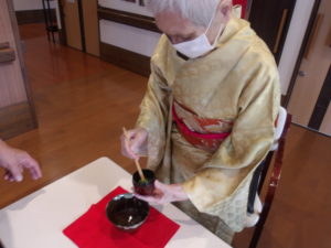 美味しいお抹茶を甘い和菓子でいただく食レクを行いました。