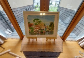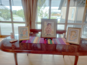 奥のリビングのテーブルに、幼子達の絵画を並べてみました。