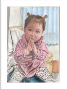 コスモスを持つのは、ママの小さい時の絵画です。