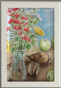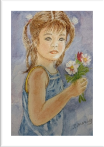 コスモスを持つのは、ママの小さい時の絵画です。