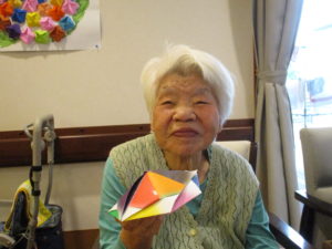 「出来るどかね?」「一緒に作って」とスタッフと共に準備された折り紙を使って作成しましたよ😊