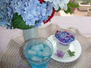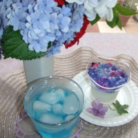 牛乳ゼリーの上に盛り付けて、涼しげな紫陽花ゼリーの完成です。(^^)/