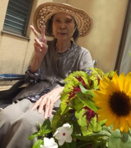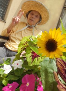 中庭に出て頂くと、「この花は、家に植えてたよ。」「こんなに小さいひまわり🌻かわいいね。」等と