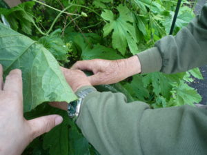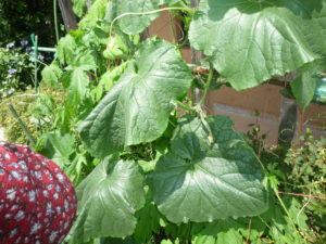 見ての通り、胡瓜の葉も青々として、人の手のひらより大きく、茎も太くなり、胡瓜も大きく成長してきました。