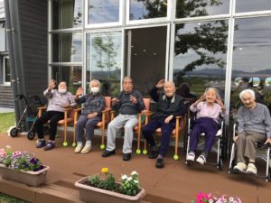 外気浴⛅は、ユニットのウッドデッキに出て、お花や遠くの山々の景色を楽しみました。
