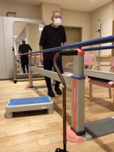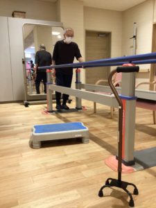 ①前向き歩き②後ろ向き歩き③横歩き④段昇降を正面に鏡を置き、自身で歩き方の確認をしながらされます。歩行時は四点杖を使用されていますが一本杖での歩行訓練に取り組まれています。
