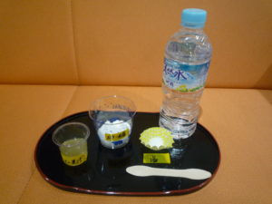 経口補水液作りの材料は(水 500ml 砂糖20g 塩1,5g レモン果汁25ml)