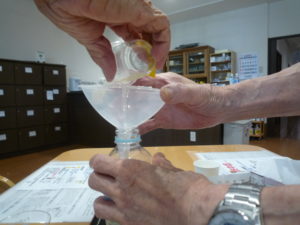 1人が、ペットボトルにロートを差し込み、両手で倒れない様に持ちます。