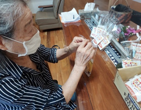 入居者様に手伝っていただき、お菓子の袋詰めです。