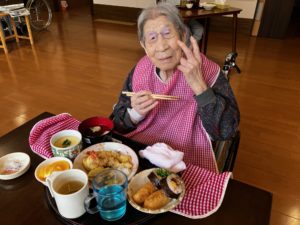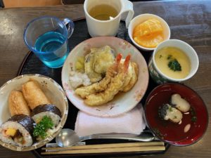 本日は敬老の日ということで、昼食は助六寿司・天ぷらの盛り合わせ・茶碗蒸し・松茸麩のすまし汁でした✨