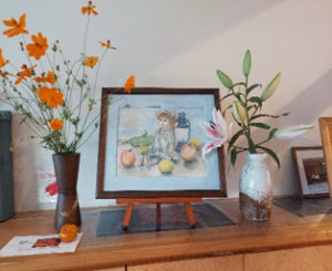 毎月変わる絵画に季節の花を添えて、季節の移り変わりを楽しんでいます。