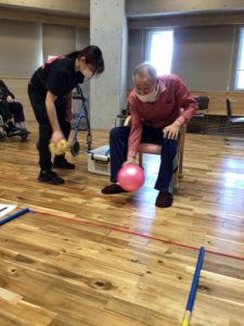 利用者様のボールがなかなか捕まってくれず、職員の思惑通りにはいきません。