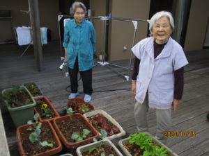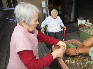 「なんば植えるとね~?」「珍しか花のあるね」「どうやって植えますか?」など、リビングにおられたご利用者様たちも興味津々でウッドデッキへ。