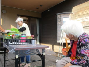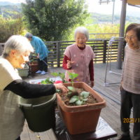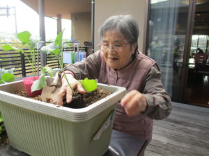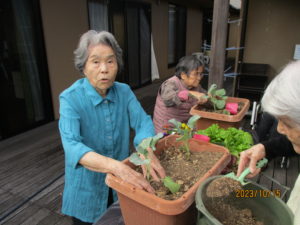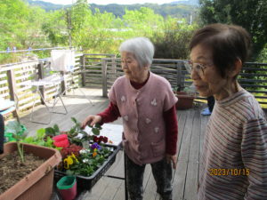 「なんば植えるとね~?」「珍しか花のあるね」「どうやって植えますか?」など、リビングにおられたご利用者様たちも興味津々でウッドデッキへ。