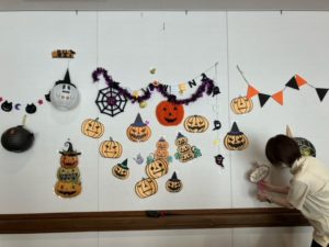 開催前に、先ずは壁に装飾とテーブルにハロウィングッズのセッティングを行いました(^^♪
