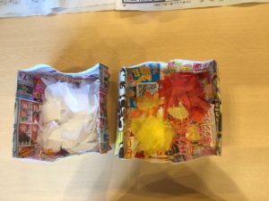 水風船で形を作り、半紙をちぎって、紅葉やイチョウの切り絵と一緒に貼っていってもらいました。
