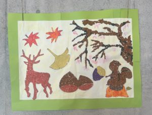 いちょうやもみじなどの絵に、色とりどりの折り紙を一つひとつ貼っていきす🎶