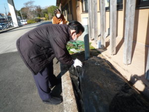 ご利用者様から、四隅のビニールを引っ張り、ピンと貼る事が大事だと助言を頂き、声を掛け合い、ビニールを張りました。