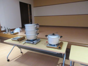 準備も大切です。石臼をお湯でよーく温めて。もち米も程よく蒸し上がってます。
