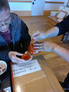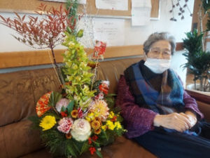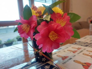 食卓花には、庭に咲いた山茶花と入居者様の家族に頂いた菊、