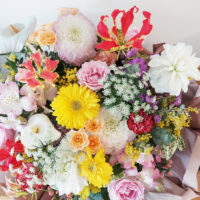 大きなアレジメントと一緒にパチリ