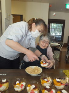 プリンにシスコーン・生クリーム・桃・バナナ・みかんをトッピング!昔を思い出して
