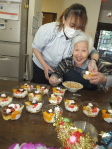 プリンにシスコーン・生クリーム・桃・バナナ・みかんをトッピング!昔を思い出して